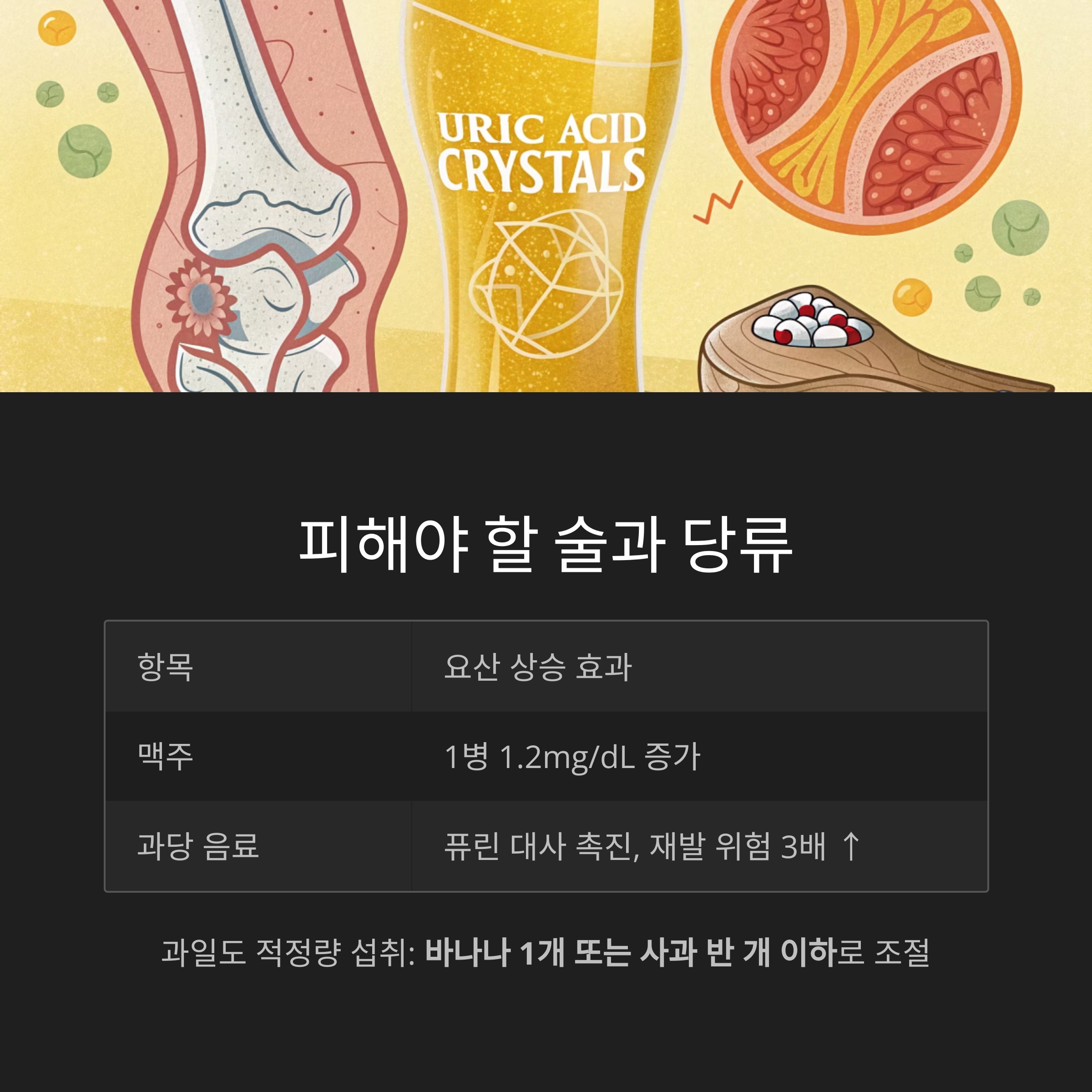 - 주의 음료: 탄산음료·과일주스(과당이 요산 생성 촉진)
