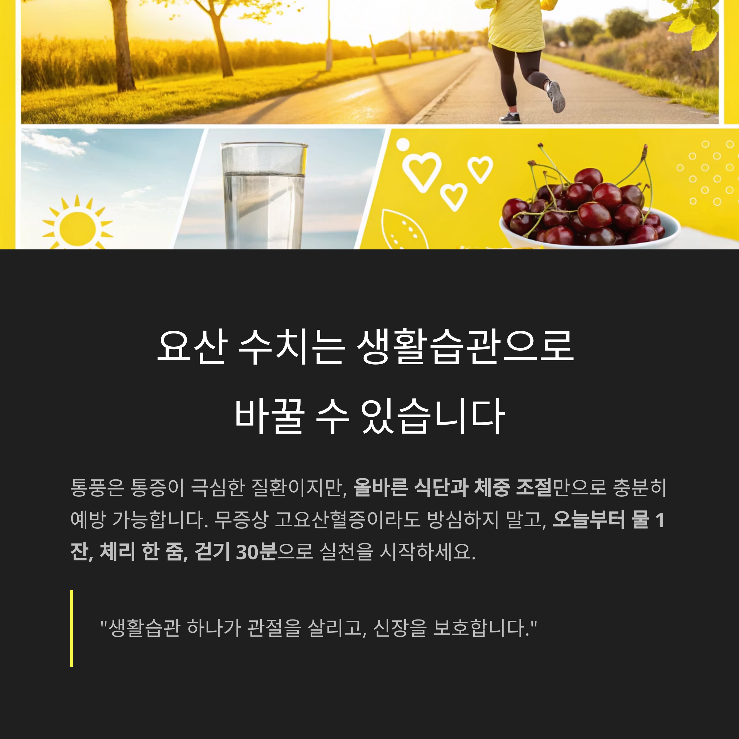오늘부터 물 1잔, 체리 한 줌, 걷기 30분으로 실천을 시작하세요.