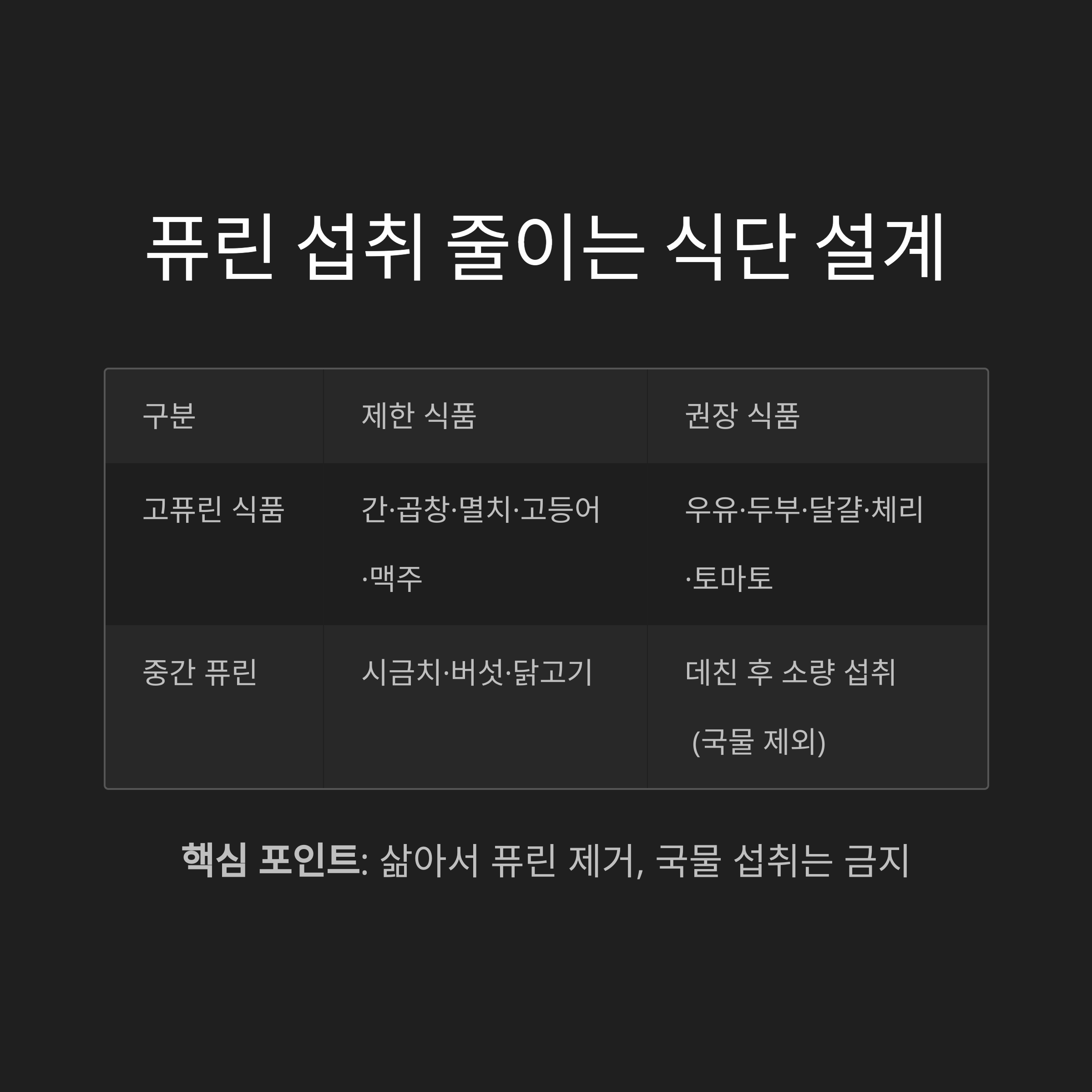 | 고퓨린 식품 | 간·곱창·멸치·고등어·맥주 | 우유·두부·달걀·체리·토마토 |