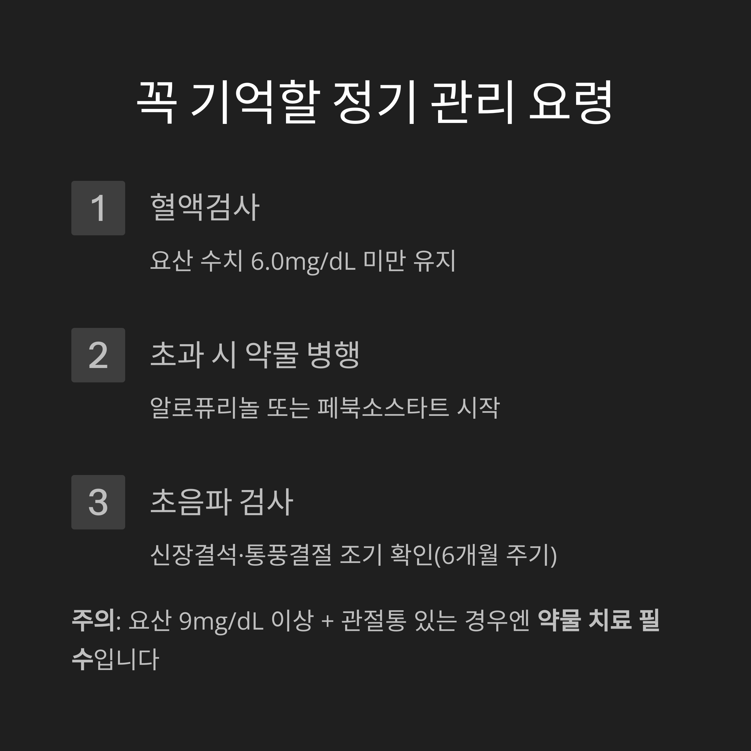 - 혈액검사: 요산 수치 6.0mg/dL 미만 유지