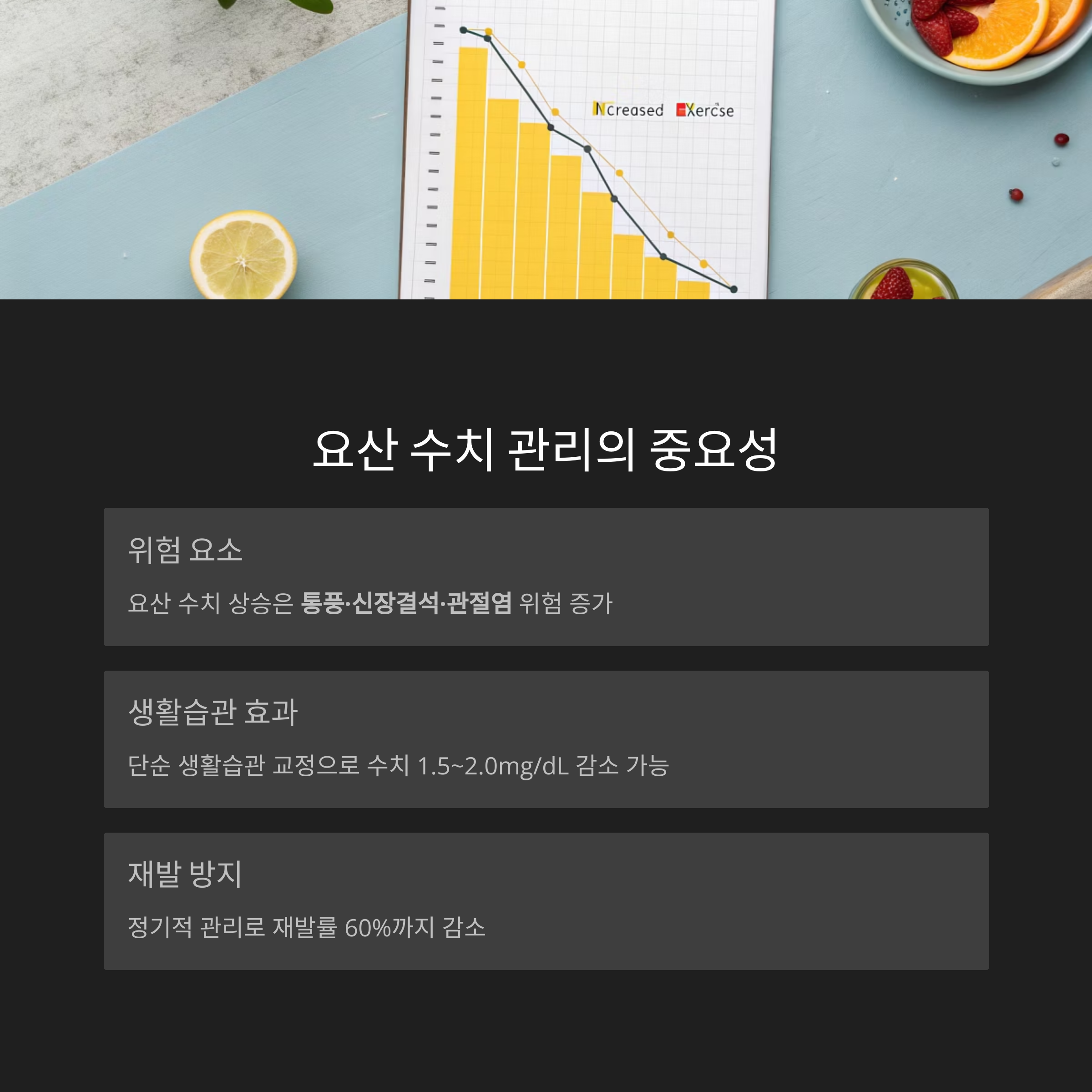 요산 수치가 높아지면 통풍·신장결석·관절염의 위험이 크게 증가합니다.