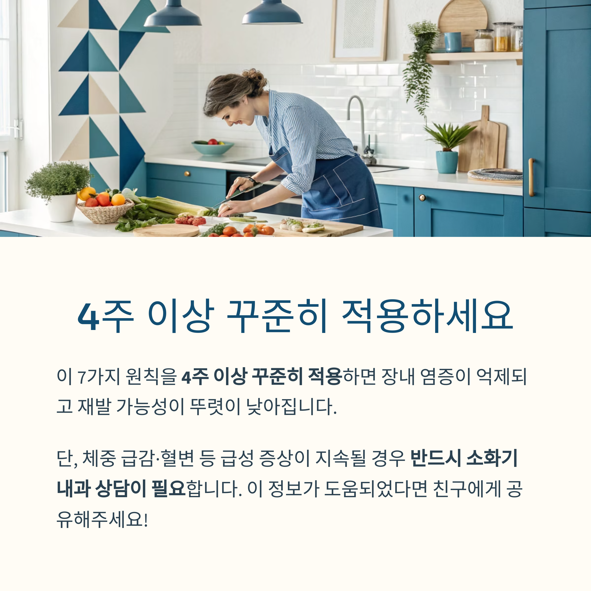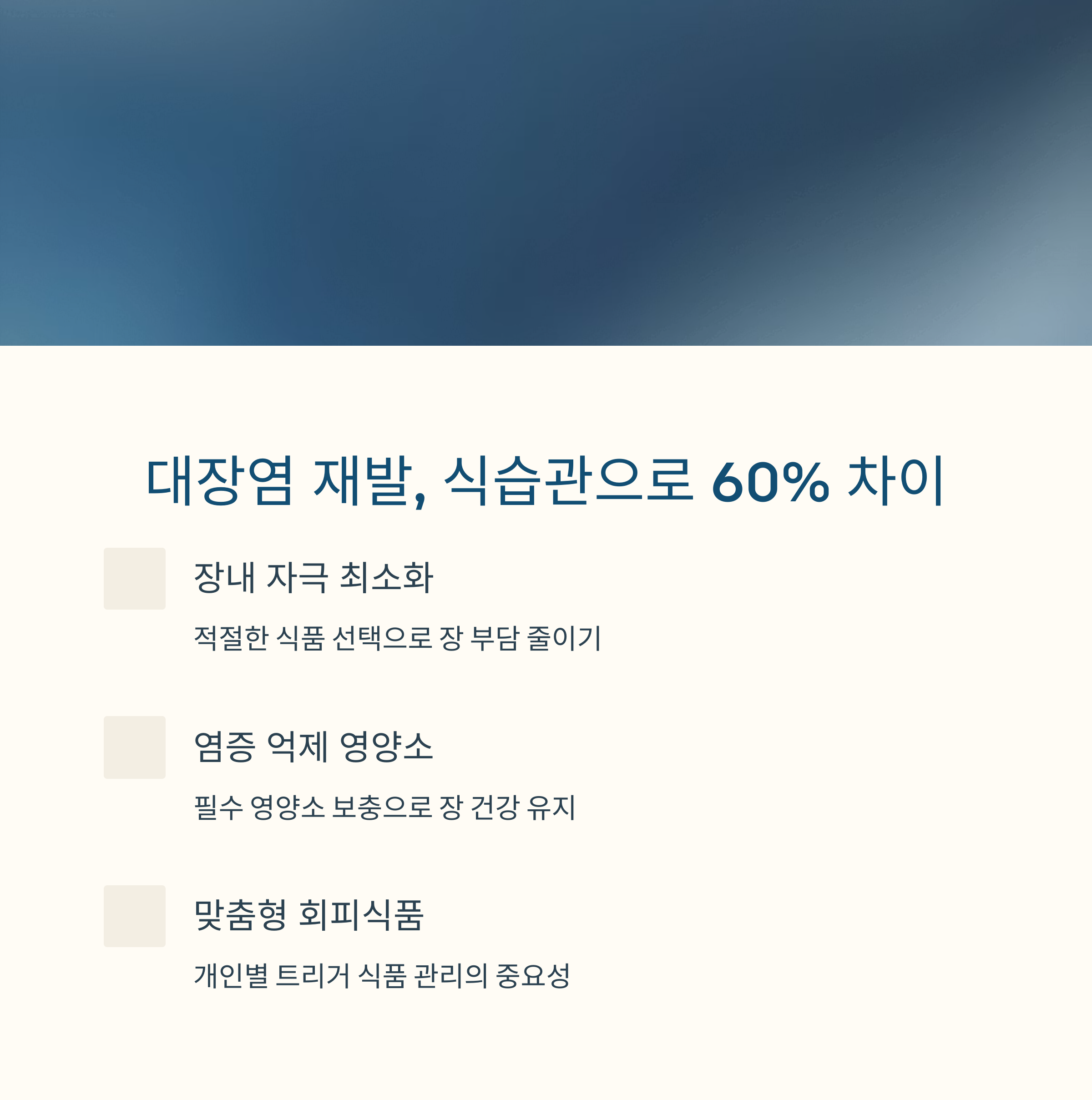 장내 자극 최소화, 염증 억제 영양소 보충, 맞춤형 회피식품 관리가 핵심입니다.