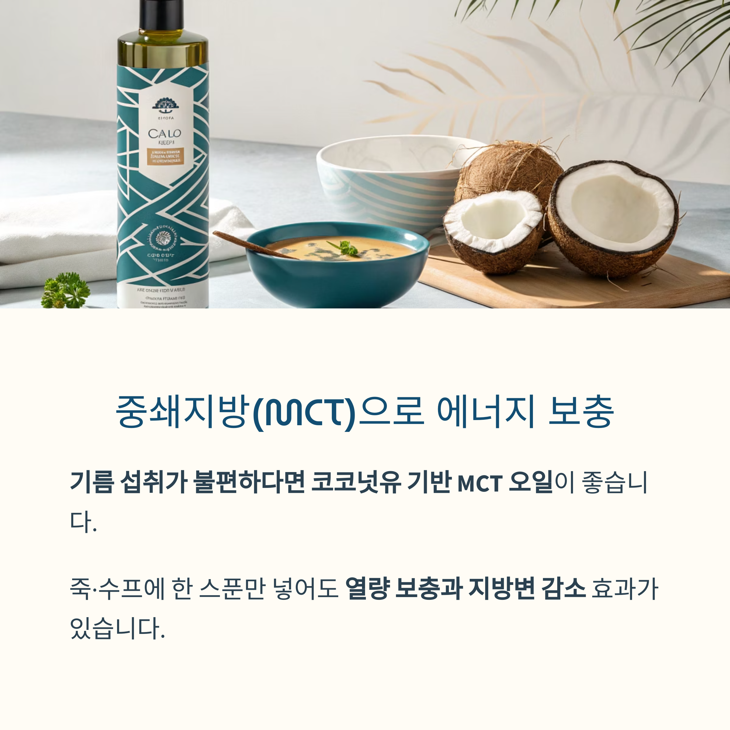 기름 섭취가 불편하다면 코코넛유 기반 MCT 오일이 좋습니다.
